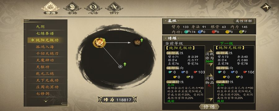 纯阳无极功,属于心法类型的武功,属性为阳。效果是可以每回合治疗自己内力30的生命并且使用阳刚或学成力提升20%,受到阴属性伤害降低20%。