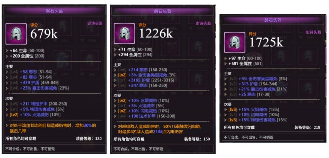 除了拥有专属技能的橙装以外,游戏当中的紫装也会随机带有特殊特质,拱大家做出更多的搭配选择。比如下面的三件磐石头盔,除了不带特质的普通版本,玩家可以根据自己的角色来选择【流血】还是【感电】作为输出手段。