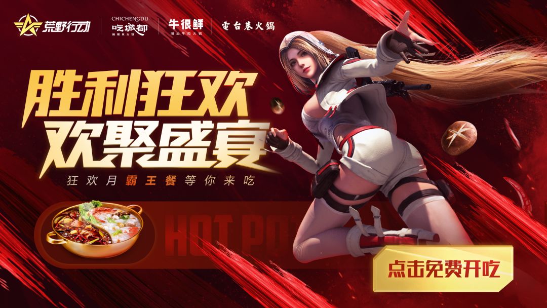 胜利狂欢,欢聚盛宴!荒野行动狂欢月霸王餐活动正式上线,将与电台巷、牛很鲜、吃城都联动。荒野主题餐厅上线,更有霸王餐免费吃!这个狂欢月,线上线下齐分享!