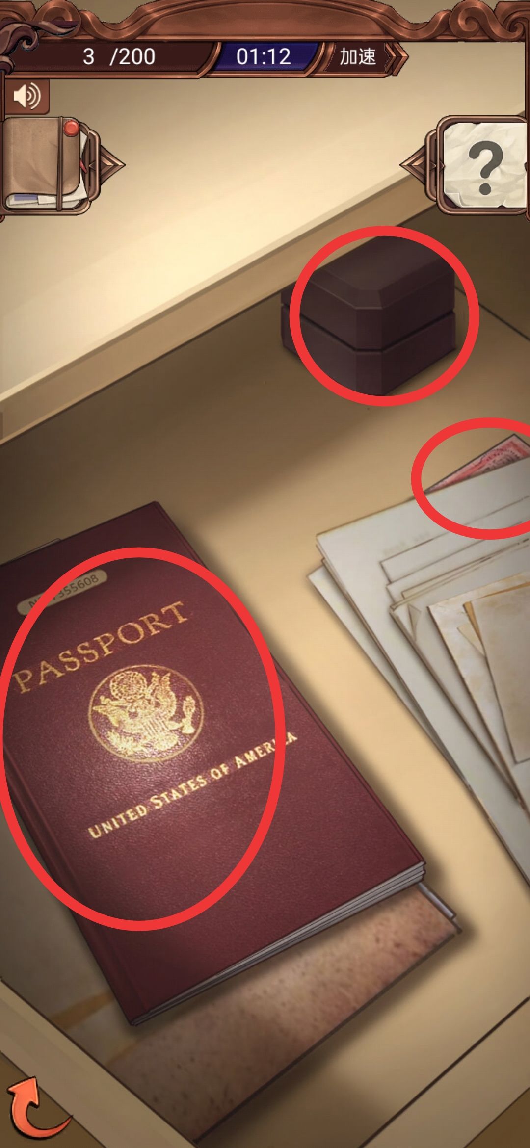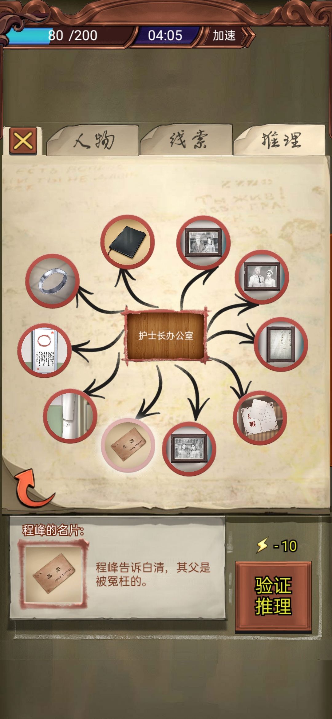 墙上的黑色挎包;桌上的金笔和病历(应该是病历);旁边柜子中有两份类似档案的线索(啊----忘截屏了,只能凭想象这么讲了囧rz )
