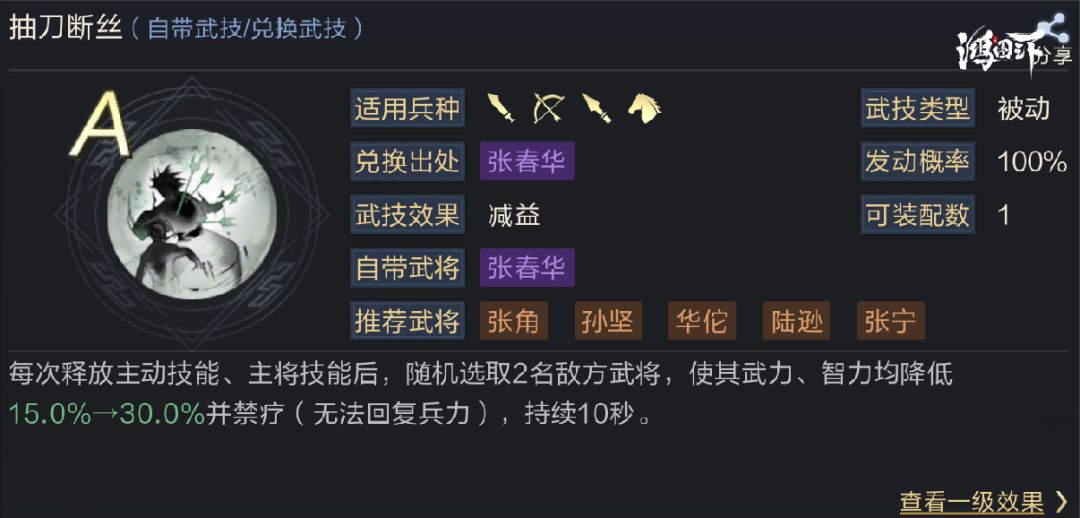抽刀断丝从S3开始便成为了部分优质阵容的标准配置,如抽刀都督、抽刀蜀枪、小三孙等等,这是由于在游戏中技能造成伤害时会计算释放者的属性、兵力,而抽刀断丝即可稳定降低目标近三分之一的输出属性,又可断绝其兵力恢复,有极大的伤害减益能力。