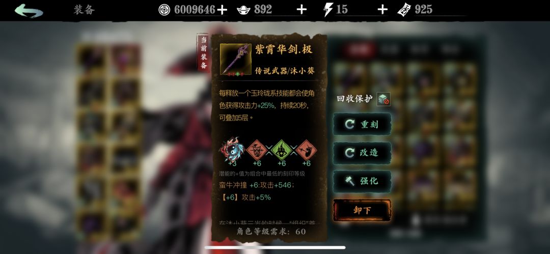 装备的话就是有什么传说带什么、护腕最好带杀意护腕(图里的没换过)、刻印我用的蛮牛、懒得洗冰山。最好不要用冰山,因为怪会落地给你一剑