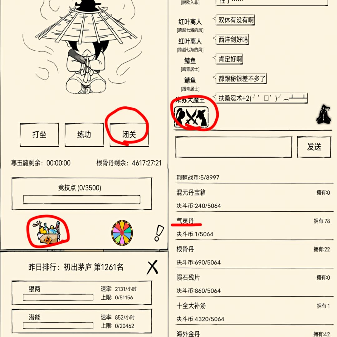 ③打坐提升内力上限(进阶内功等级提升1级,即可打坐10点内力),也可选择用气灵丹代替打坐。