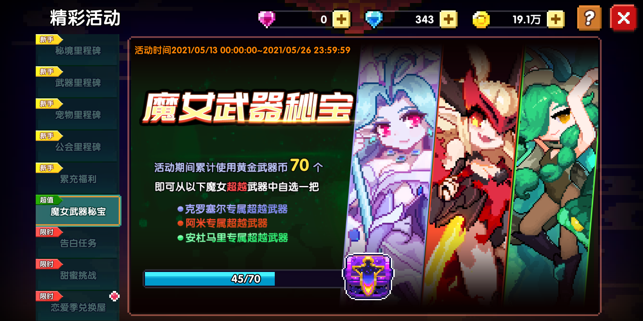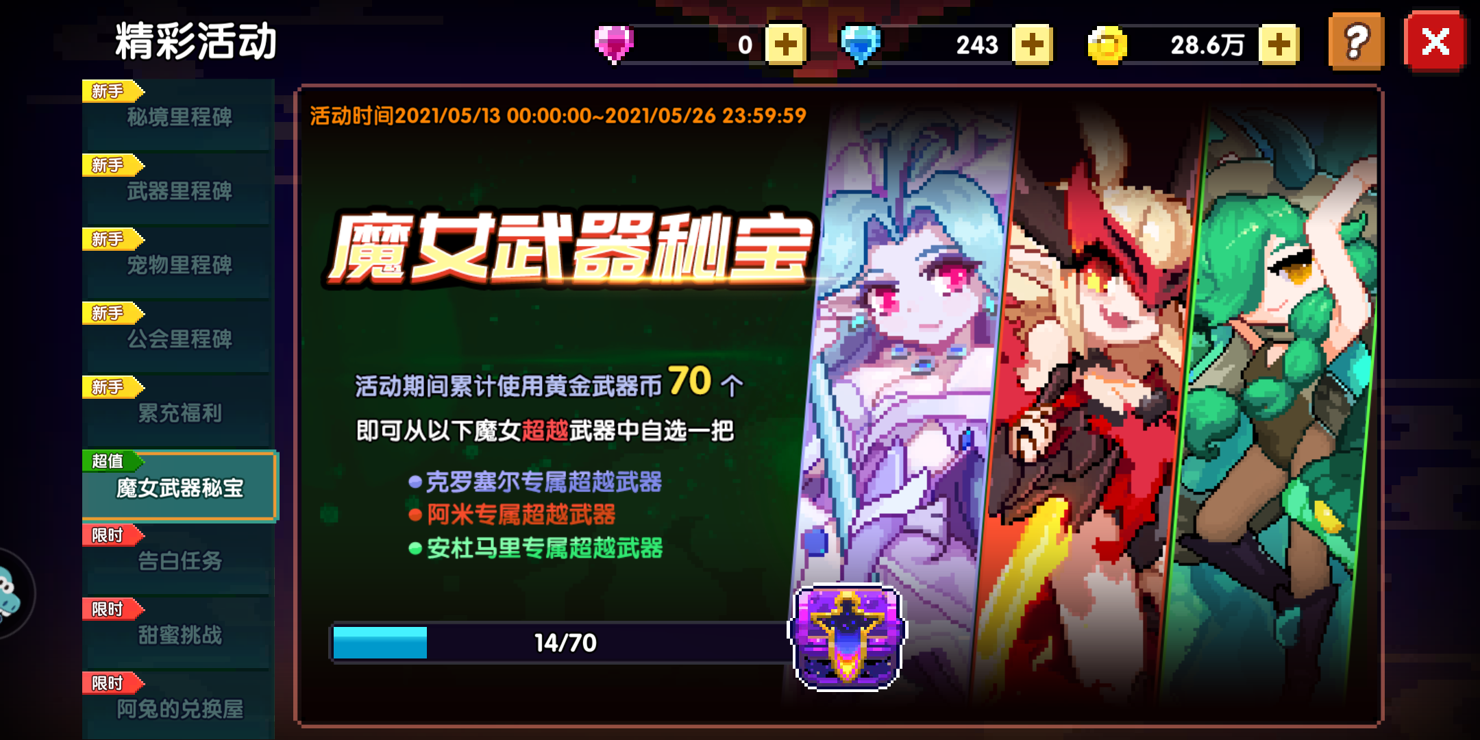 3.竞技场全部任务做了,全换黄金币,尽早抽完70个领2个魔女武器自选宝箱。武器尽量升级单个到3星。我是后来出了红武才升级红武