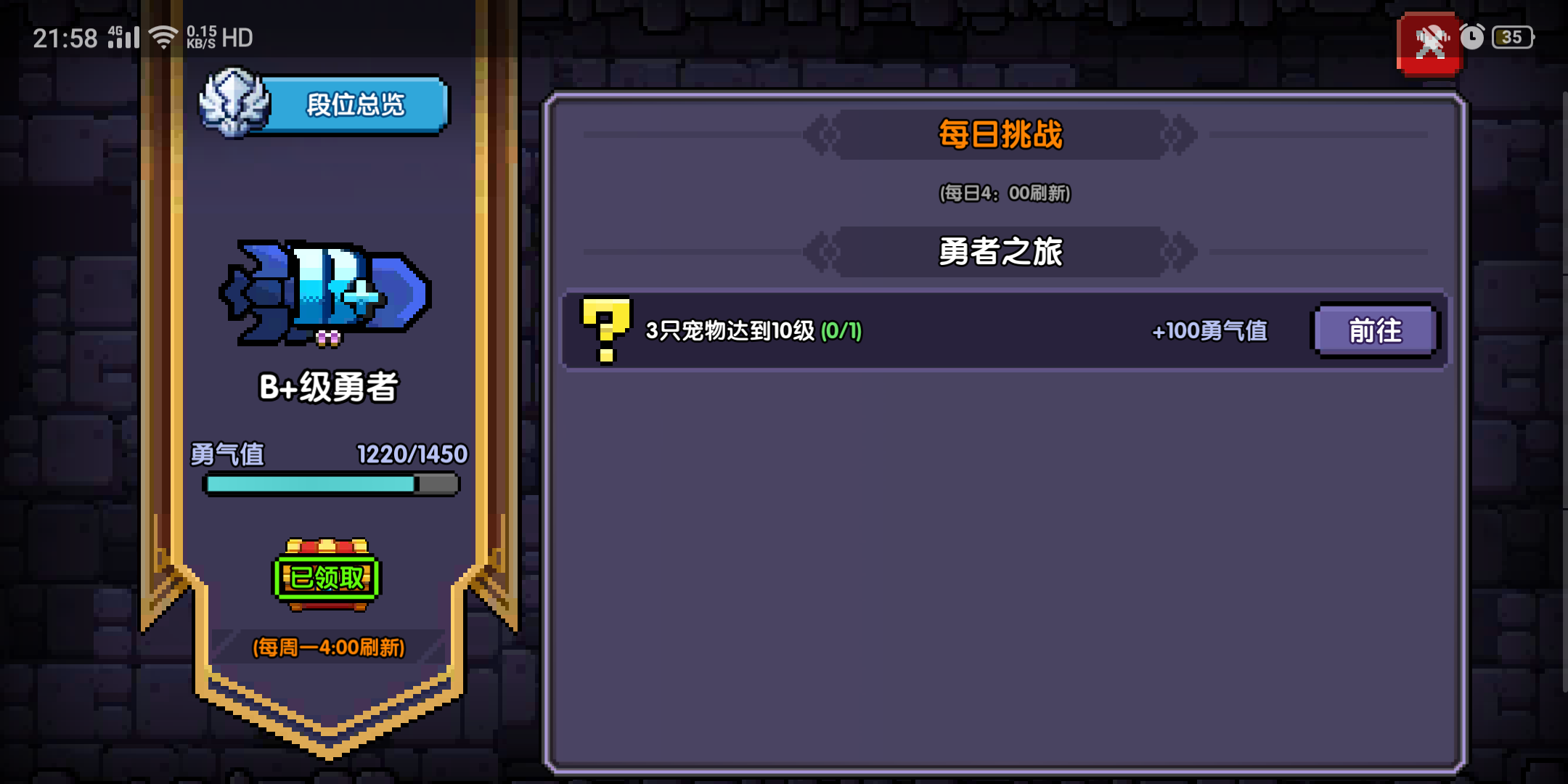 任务做完等级到了17,段位到了d+,黄金币拿了14个,运气好,抽到了红武。宠物探险能探险到1-10。能进工会了。