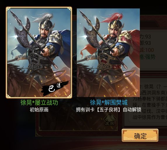 技能二:治军严明,徐晃担任中央将军的合,所有外派军团训练度不会下降并减少3%的叛乱率。