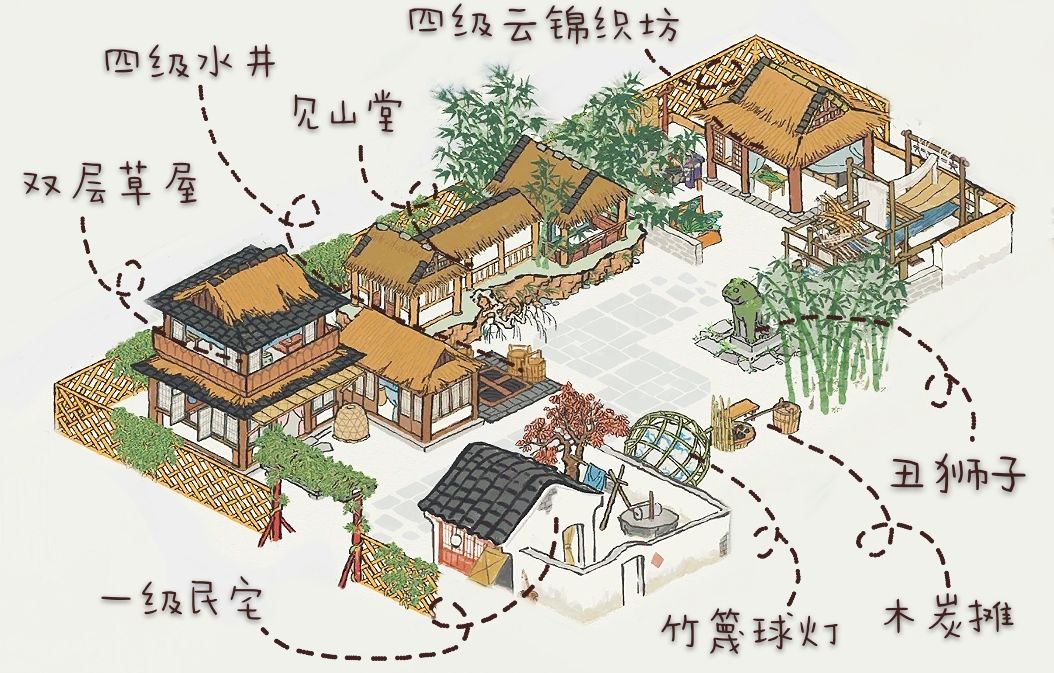 双层草屋和斗茶摊的可搭配性真的很高!和应天府的云锦织坊、杭州府的折扇作坊团扇作坊、松江府的五级煮盐场四级制鞋场、四级仓库、大部分生产建筑等都可以搭配!