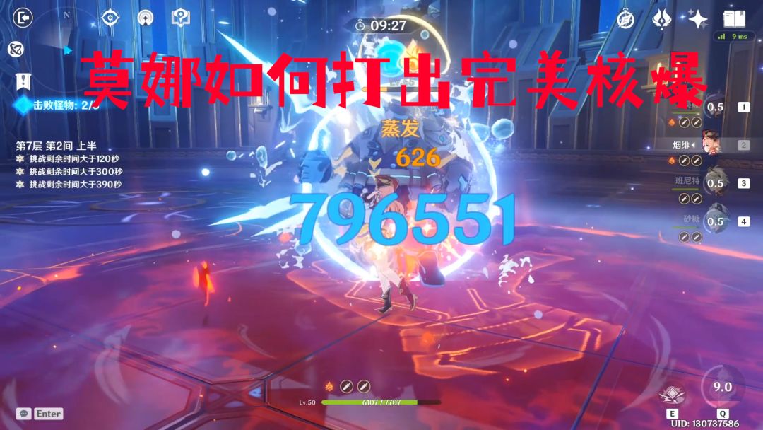 step6 等个2-3秒的附着内置CD时间,切出烟绯或是班尼特,用火元素攻击,触发莫娜大招的伤害,并让其打出蒸发效果,完美核爆完成。