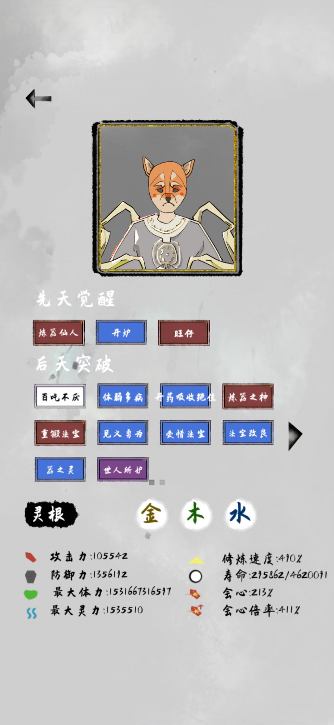 得丹炉者得寿命,得体力,得会心,得会心倍率,想一想丹药没有抗药性,随便吃着玩的恐怖情景吧。过心魔小贴士,背包里面全部留着白装的召唤法宝,心魔会随机那你背包和身上的法宝来和你对线,然后神器彼岸花和寒冰晶体必带,其他随意。最理想的天赋为XX转生,丹炉,丹体,最好2到3灵根,4到5灵根可以是主人公,丹炉,丹体。记得每次大境界后去商店买药吃哦