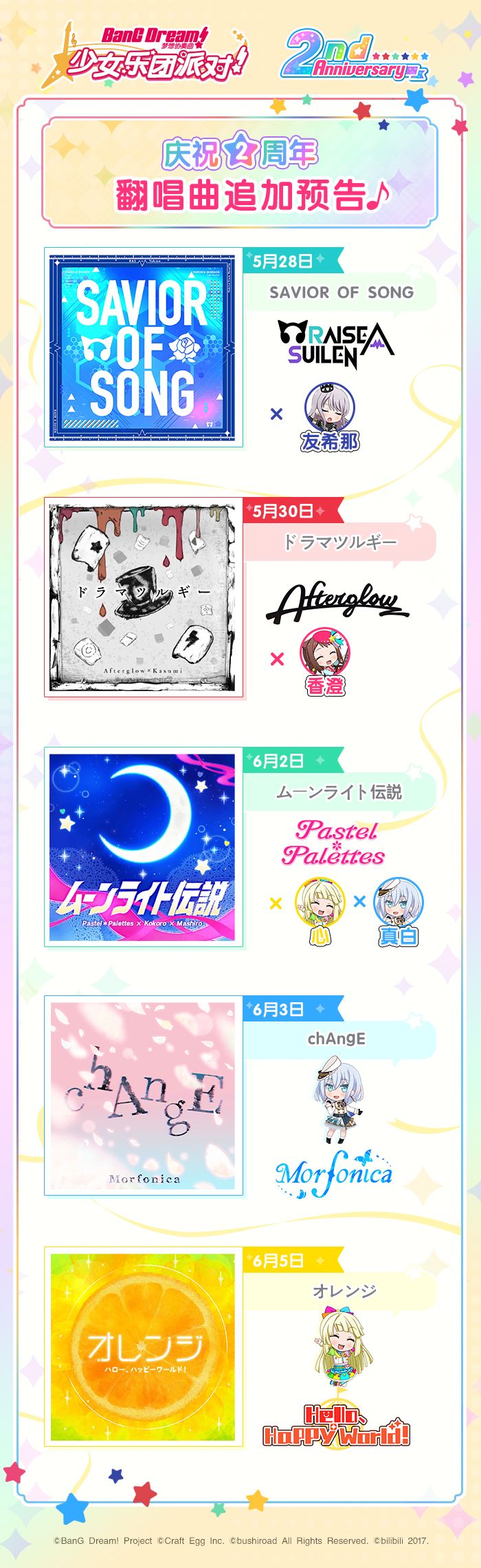 为庆祝即将到来的2周年,游戏内将陆续追加5首翻唱歌曲!