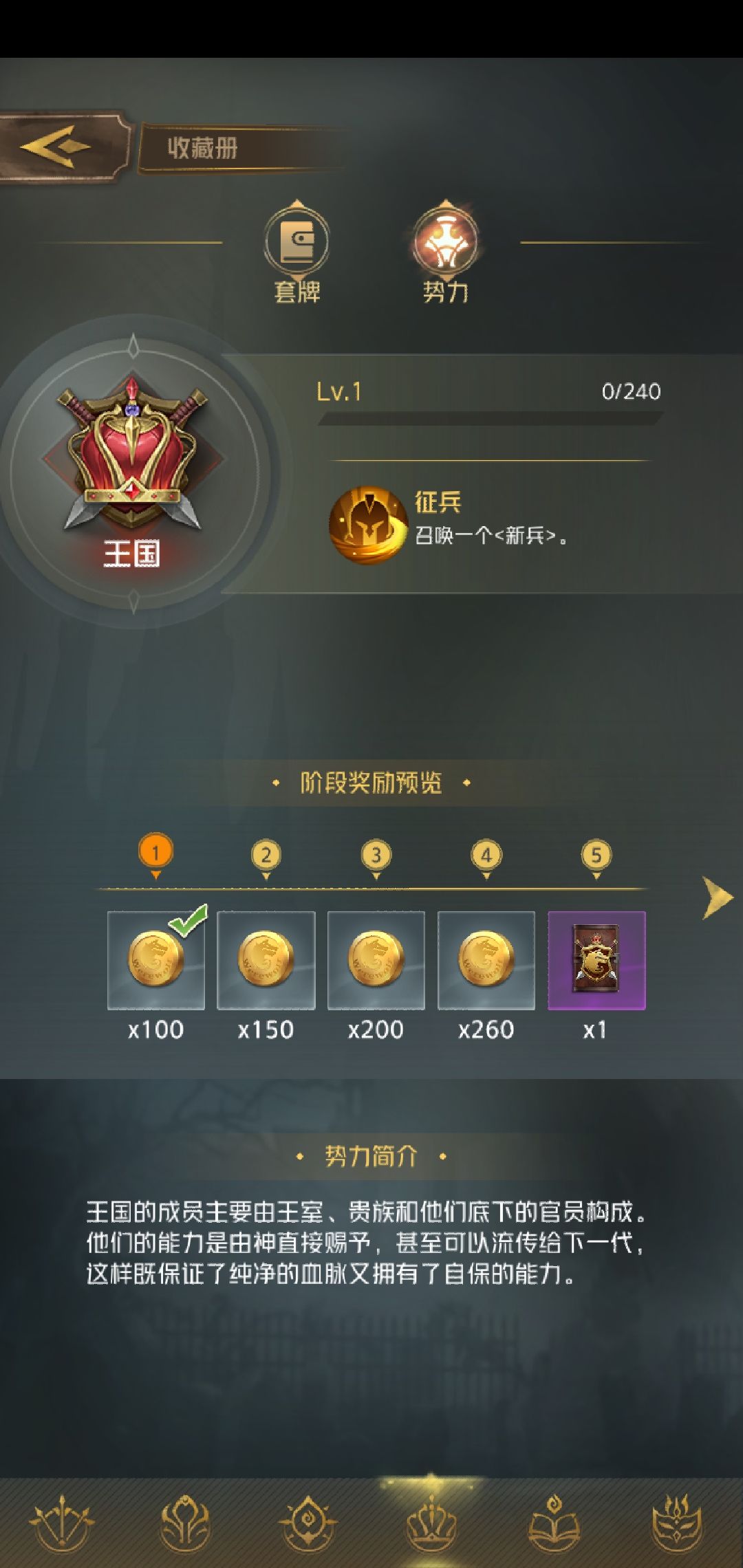 王国的村庄技能是召唤一个契约值为1的新兵,新兵的主要作用可以用来占场和挡刀,可以在场上没暴露牌的时候后手召唤一个新兵