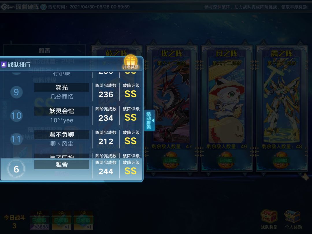 13级战队雅舍收12w9,55w神宠听指挥的哥哥姐姐,上任战队赛前十战队,这次继续冲击前十,有意向的大佬们都看看鸭