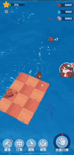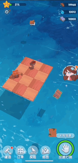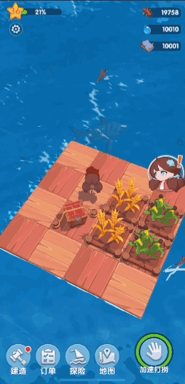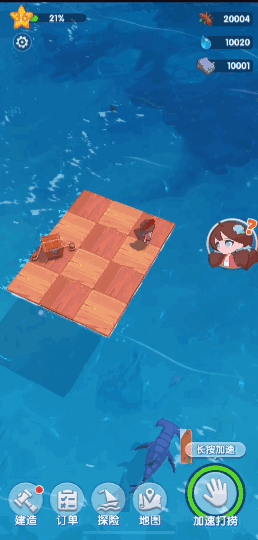 在游戏后期,种植农作物和加工道具都需要大量的基础材料,即水滴、木板和铁块。为了防止玩家对于不停捞垃圾感到无聊,并且便于玩家可以迅速获得大量材料,我们设置了“加速打捞”按钮,长按按钮就可以让主角汐汐自动地加速打捞哦!