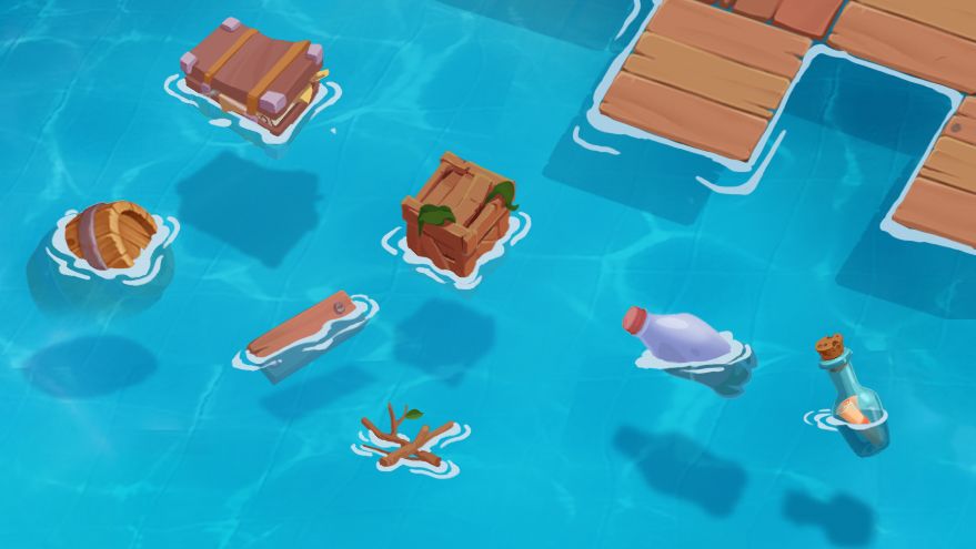 那么只有一块破木筏子的汐汐要怎么在海上求生呢?当然就是捡垃圾啦!海中的垃圾有水滴、树枝和铁块三种,这三种材料也是种植、生产的关键道具。海上漂浮的垃圾有很多种形态,如箱子、瓶子等。不同模样的形态会获得不同数量的垃圾。