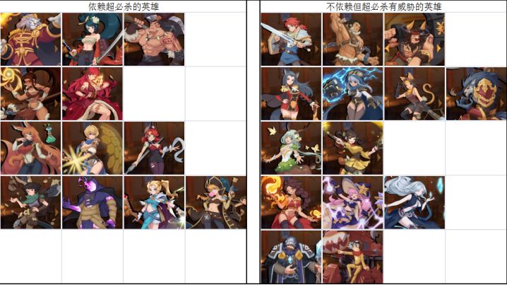 如下图,我根据每个英雄在有无超必杀的情况下,能够发挥出来的力量进行了分类,左边是极度依赖超必杀的英雄,没有超必杀的情况下,只能打打辅助,有时候甚至连辅助都打不了。而右边的英雄是即使没有超必杀,也能发挥出不错的效果,但是有了超必杀,其威胁会更上一层楼。而图中未涉及的英雄则是无论有无超必杀,发挥都比较稳定的英雄(比如牧师)。