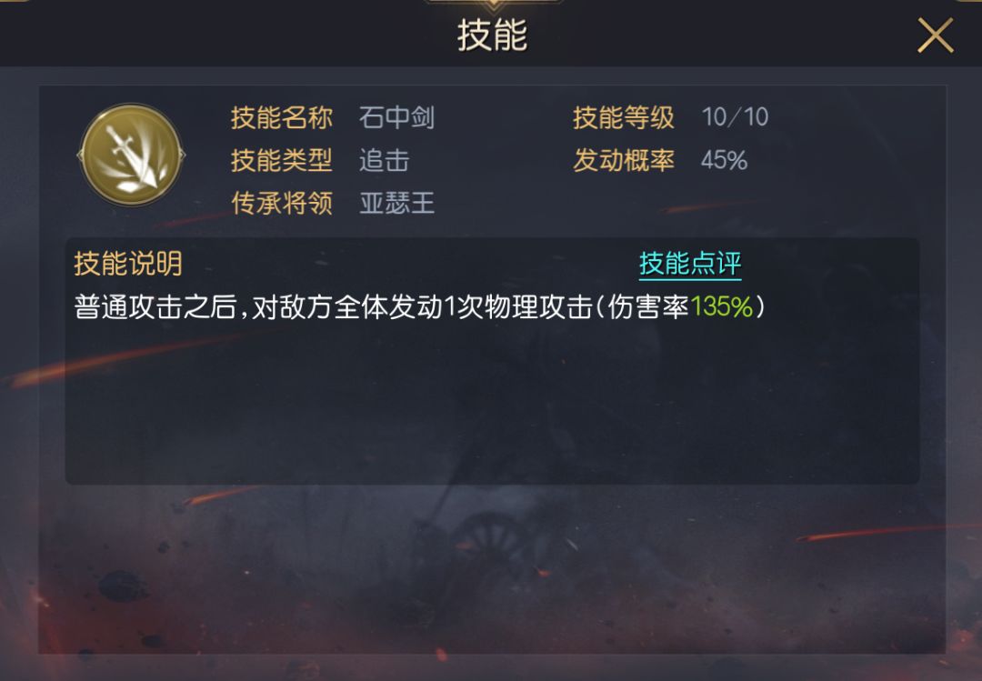 三技能推荐石中剑,发动率和伤害率都比较出色,作为全体攻击类技能,能与吕布的飞将、群攻配合,快速压低敌方兵力。