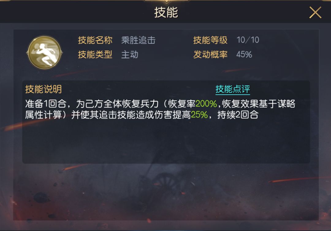 三技能推荐决胜冲阵,该技能可造成较高的群体伤害,并获得抵御,吕布不但是队伍的核心输出,也是主将,保证他的兵力健康是队伍的首要目标,该技能兼并输出与承伤,非常适合吕布使用,5%的牺牲兵力远远低于被抵御免疫的伤害,性价比很高。