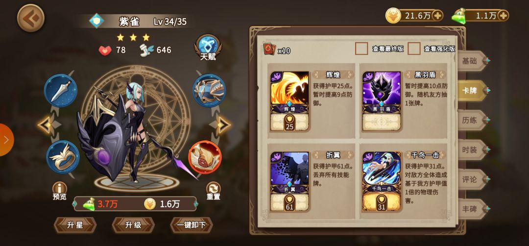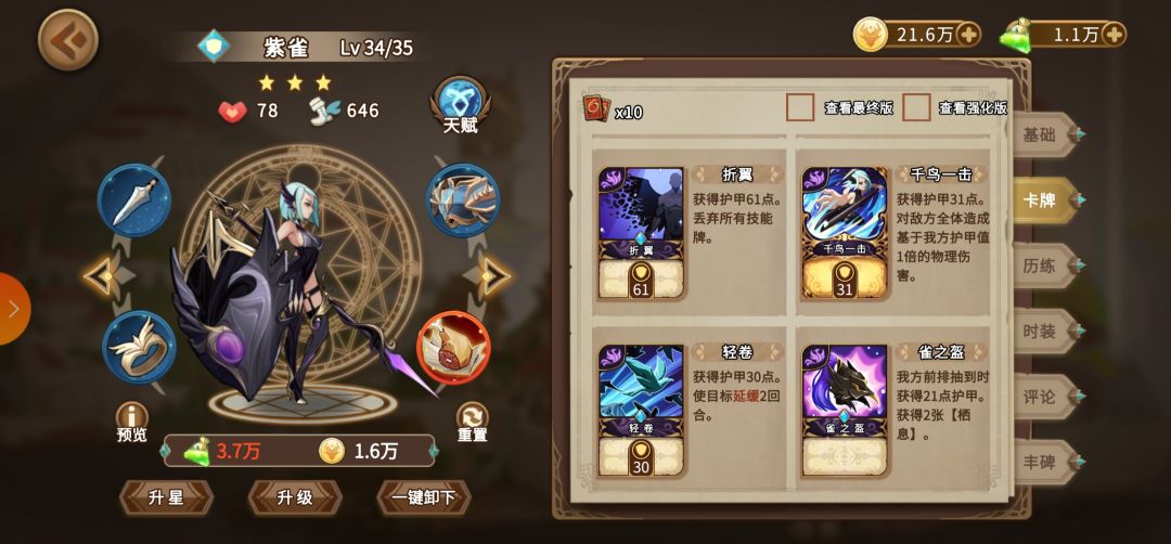 紫雀的牌没啥好讲的,和另外三个人的配合也几乎没关(黑羽,雀之盔和迁徙刷牌可以刷大招还不错)