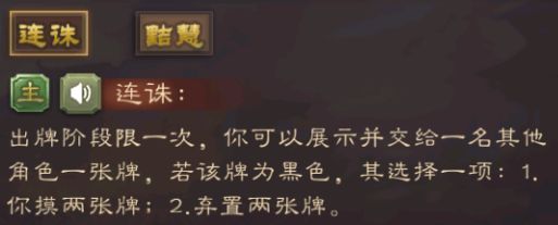 连诛给黑色才能触发摸牌弃牌,达到自己多摸或者控制敌人手牌的目的。极少情况下给红色,比如4个桃溢出了可以给队友,或者给界关羽红色的诸葛连弩。