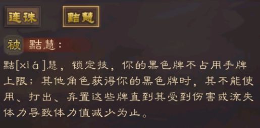 张松、星徐晃、王粲、陈宫、刘协、曹叡可以把连诛的牌给回董白解除黠慧。董白连诛王粲的话只能给黑色装备或者锦囊,否则无法七哀给回来;同理给陈宫装备。