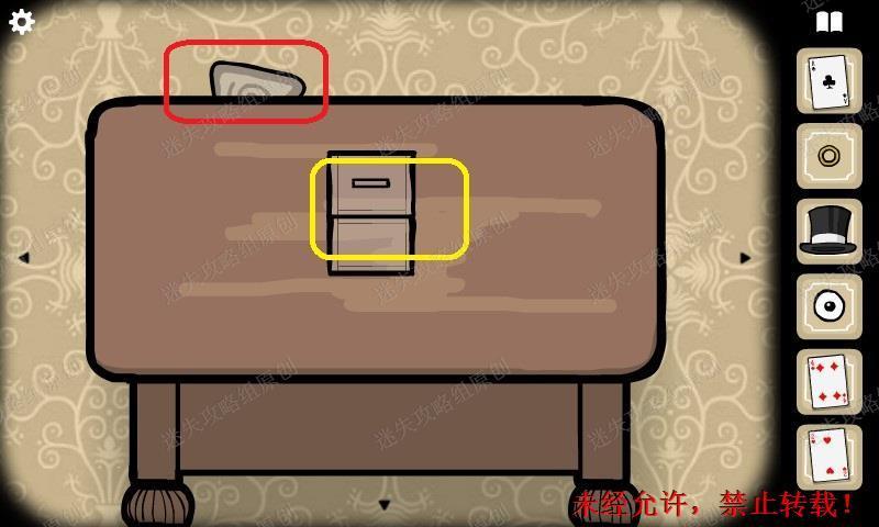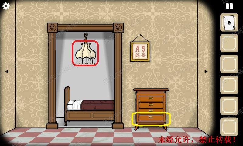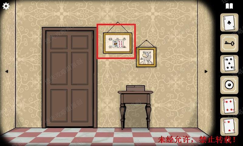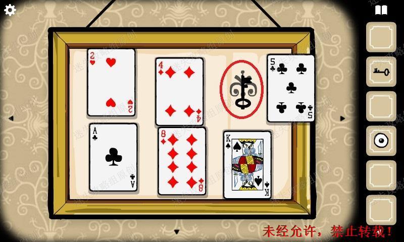 33、前往有门的场景。对红框点击放大后使用全部扑克牌(四张)。需要将扑克牌与对应符号进行搭配覆盖,提示就在房间里各处,下面直接用图片进行说明,完成后草花5会动一下同时有音效,拿开草花5后得到一把钥匙。33、1、2、3、4、5