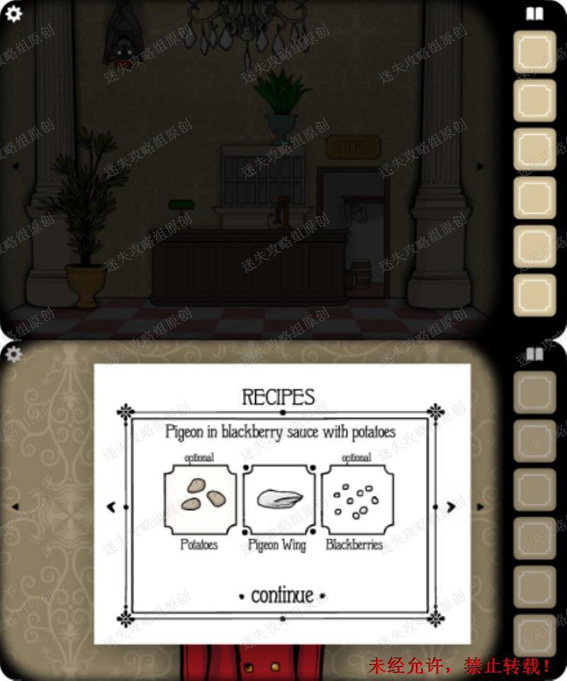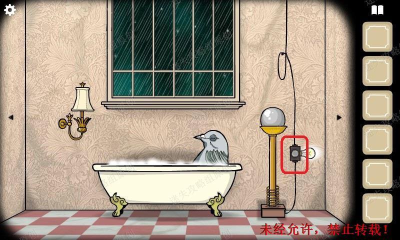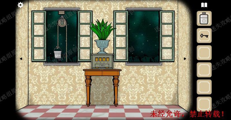 🎄鸽女士ROOM5-第三关🎄38、首先,不要上电梯。跟乌鸦先生对话也只是让我们去看看能不能帮房间里的客人。转到两扇窗的场景。可以看到一颗流星划过。在乌黑的情况下到处转,每个场景都停留两秒,可以在某个场景看见一双白色的眼睛闪烁一下,点击对应位置,会稍微变亮一点。如此重复四次后多转几次,可以看见服务生又站在电梯边上了,点击服务生,得到马铃薯。土豆炖鸽肉配黑莓酱的第一个配菜到手。上电梯,前往二楼右侧房间,ROOM5,鸽女士房间进入。38、1