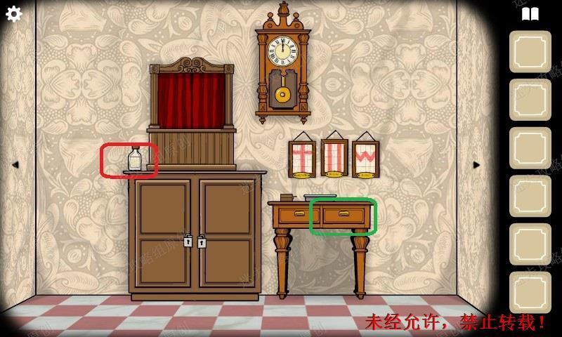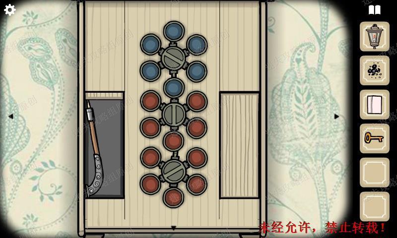 63、前往钟表场景,点击下方的桌子,桌子上最左边的音乐盒点击后输入之前猫头鹰先生胸口观察得到的密码。完成后点击红色摇柄,播放完成后音乐盒的抽屉打开,得到里面的钥匙。63