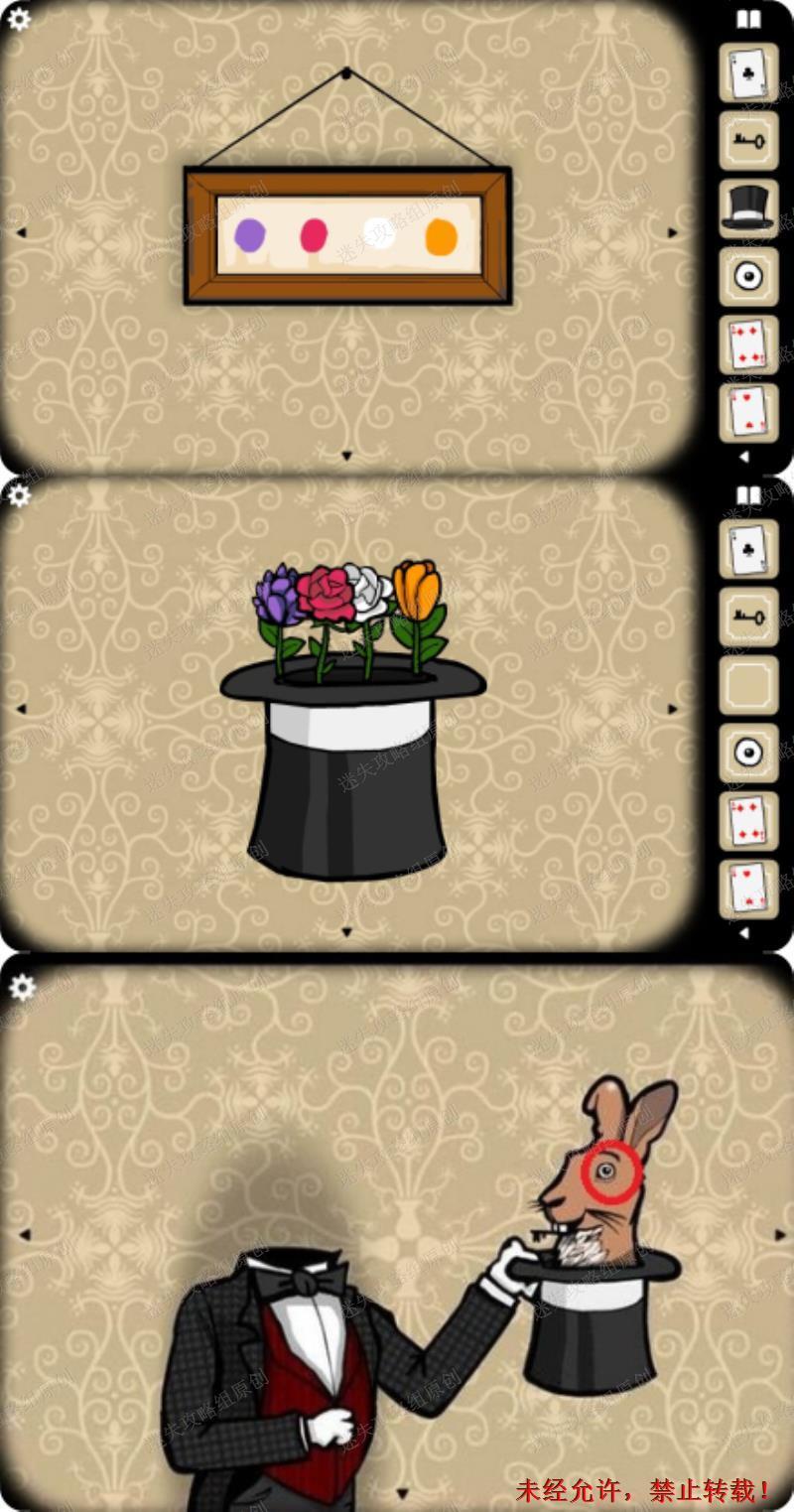 32、点击兔先生,给他戴上帽子,然后点击兔先生后他会变出四朵花。我们需要对四朵花进行排序,顺序就在之前我们投入戒指的柜子上方。依照顺序放好后点击帽子多次,等画面显示到兔先生处后点击帽子,兔先生的头会从帽子里出来,出来后点击兔先生的眼睛处,嘴里会吐出一把钥匙。当兔先生头在身体上的时候可以点击他的眼睛附近,他会拿出一个草花5牌。32、1、2