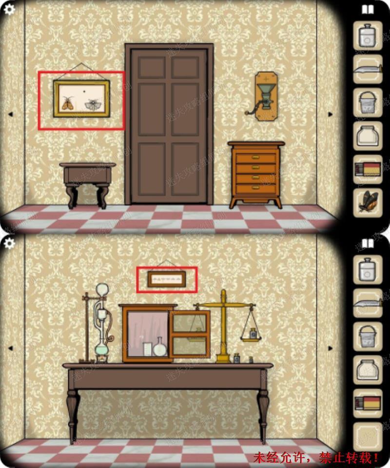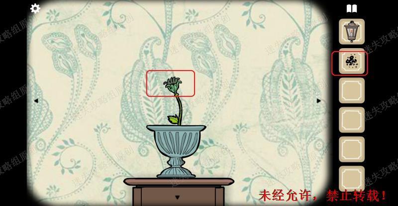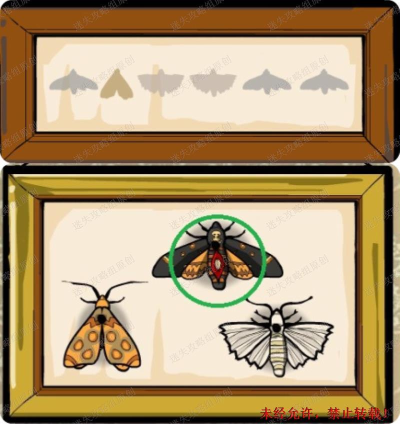 16、前往大门处场景,左边的蝴蝶标本处点击后放入蝴蝶。然后依照提示顺序进行点击,顺序的提示在之前三个瓶子装水的玻璃柜上面有。完成点击后上面的蝴蝶腹部会被割开,拿到种子。16、161、162
