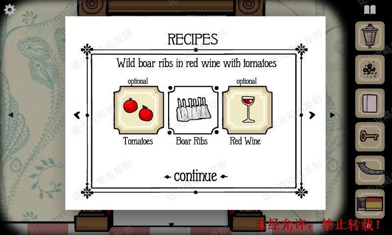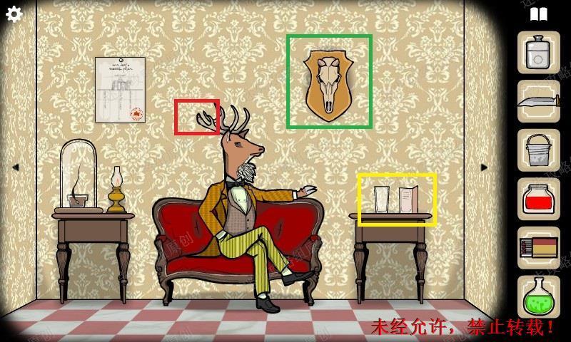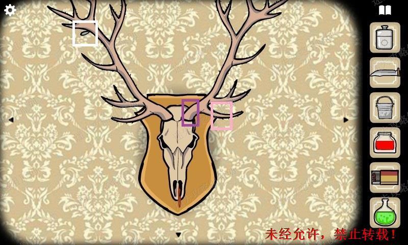 22、鹿先生右上角绿框鹿头装饰点击放大后,先点击紫框,点到不能点了点击粉框,左边也会长出来,在白框处点击后长出植物,点击得到迷迭香。继续点击粉框,骷髅下面会滴出红色液体,用玻璃瓶装好得到塔巴斯科辣椒酱。20、22