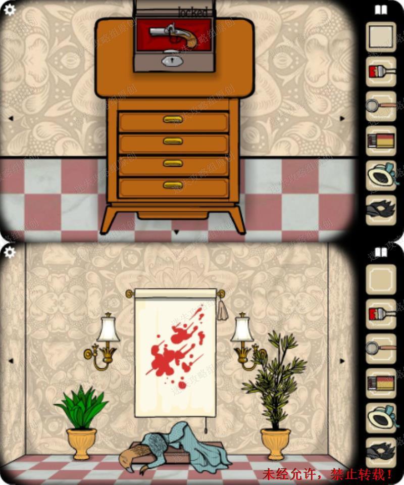 64、前往大落地窗的场景,左边抽屉柜上面的上锁箱子使用钥匙后得到里面的手枪。手枪交给鸡女士,之后帮她再拍照,依照完成,点击尸体得到鸡胸肉。64、1