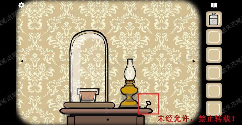 9、然后是鹿先生右边(画面左边)油灯桌上点击放大后得到下图红框处的钥匙。9