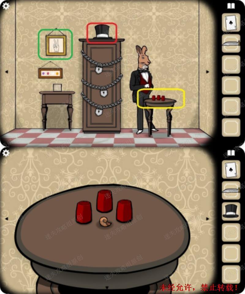 31、前往兔先生处,对左侧桌子点击放大后得到红框处的三角石头。然后把之前得到的戒指放到黄框里,会吐出一把钥匙。31
