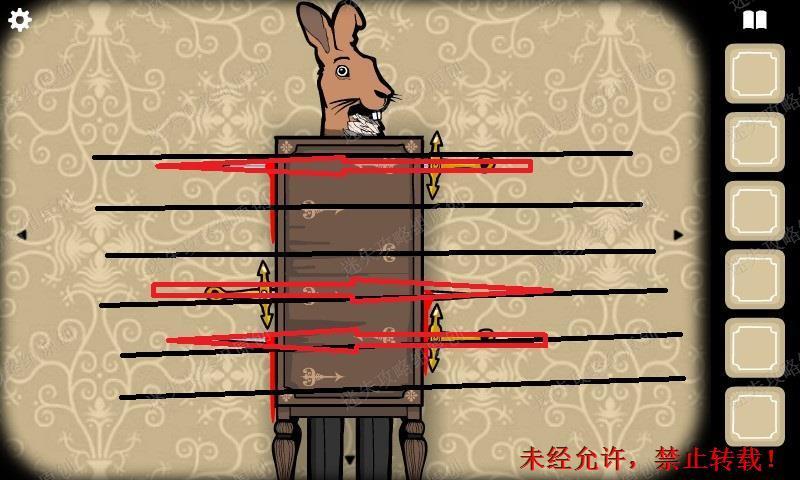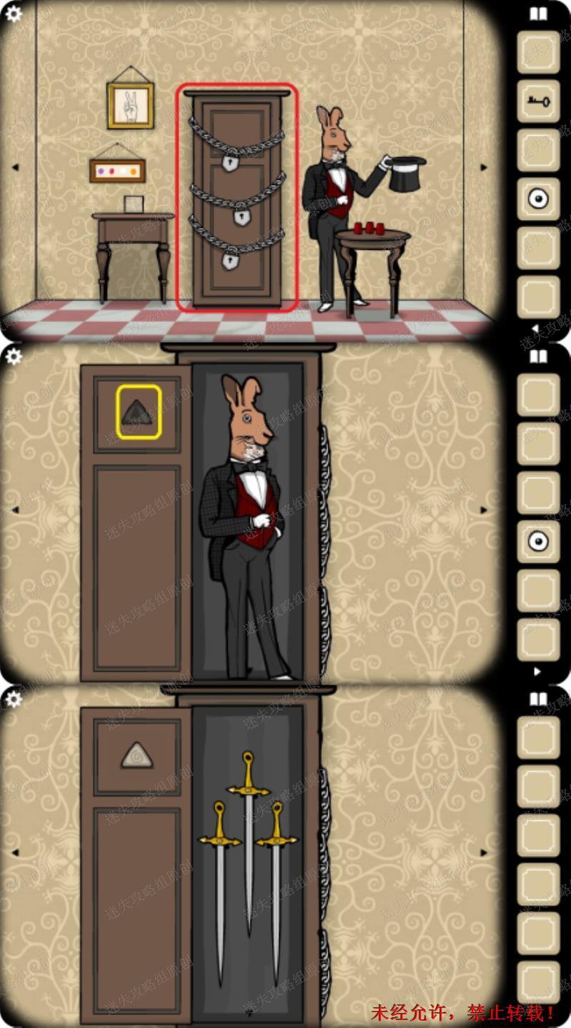 34、三把钥匙齐了,直接前往兔子先生所在场景。将三把钥匙对中间柜子使用。打开后发现兔子先生在里面。对左侧黄框的三角凹陷处使用三角石头,放好后关上门再打开。兔子先生变成骷髅,装上之前得到的眼睛,关门开门,兔子先生恢复了。再关了开,三把剑入手。34、1、3
