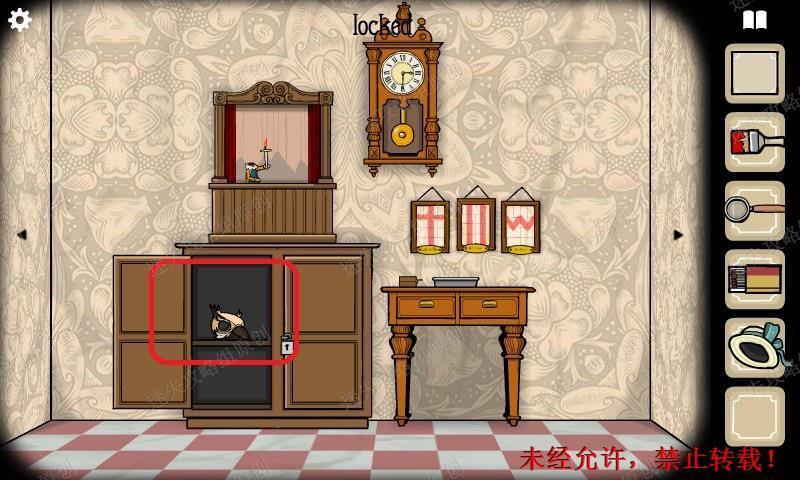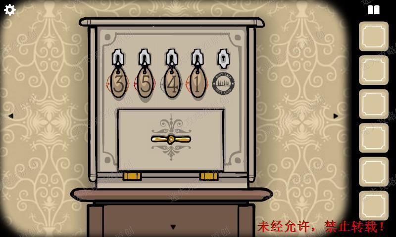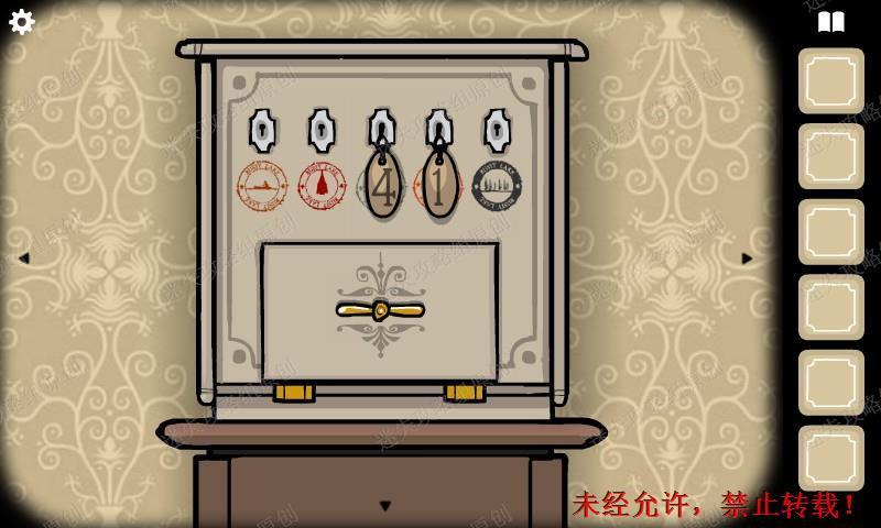 74、厕纸下方的解谜,提示就在红色帘幕的场景墙上。依照提示输入后打开柜子得到烟管。(解谜方面,一个个转就行了,没什么难度。就是时间长)74、1