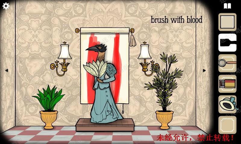 52、前往下图大落地窗处,红框处得到刷子,黄框得到放大镜,绿框得到火柴盒。之后打开落地窗,会有一只手爬上来,点击窗户关上,再点击几次,手逃走,得到一摊血,用刷子刷血得到蘸了血的刷子。52、1