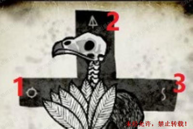 39、进入房间后,先与鸽女士对话,她会毫不客气地让我们给她一些玉米吃。不管她,先去往下图场景。场景中首先是红框位置的图纸,记住图纸上印章的图案(后续电梯旁密码箱要用)有印章的这个图纸背后有一片纸,记得拿。下面绿框收音机背后也有一片纸,拿上。同时红框图纸和蓝框图纸提示组合后得到四个符号的答案:漩涡=6、S型=8、三角=1、方块=3。39、1