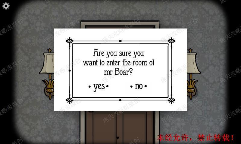 7、拿到配料后就可以直接点击电梯,稍后电梯到达后进入,选择数字1前往2楼(英语环境中,一楼是ground,二楼是first floor(直译为第一楼层),所以数字1代表2楼)。到达后出门。首先前往左侧红框处的Room1。点击后会询问是否进入鹿先生的房间,选择Yes是即可进入。7