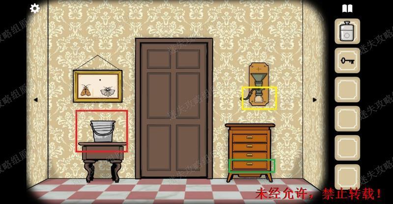 10、转到房门画面,得到下图红框处的桶。黄框处得到的玻璃瓶。绿框处点击打开后得到火柴。10
