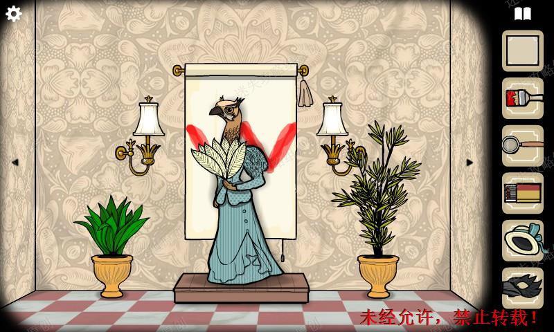 53、前往门和照相机场景,右边的相框上有一把钥匙,入手。然后去墙上有钟的场景,下面的锁柜右边的柜子使用钥匙,得到帽子。把帽子给鸡女士戴上。最后需要把鸡女士背后的画布拉开(边上有个拉的地方点一下)。然后点击画布,用刷子把画布刷成需要的图形,提示在墙上有钟的房间有。帽子是蓝色的,所以代表了“蓝衣女”,如图完成(可以多涂几笔……左边的灯亮了说明涂到位了)。53、1、2