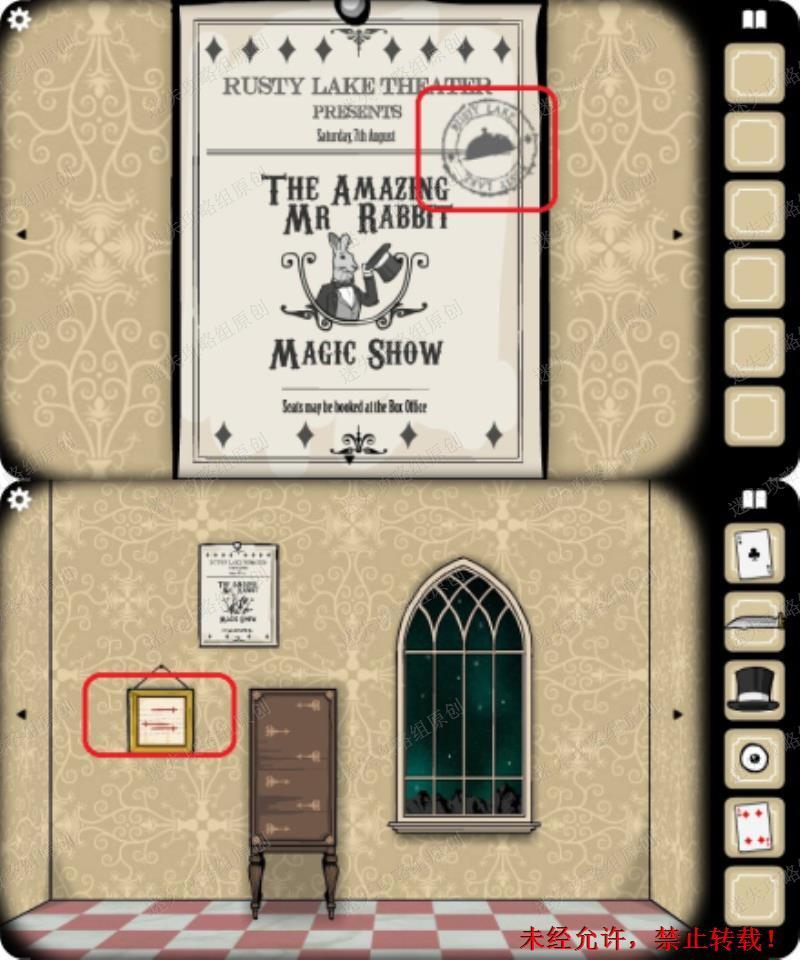 27、不急动手,先找到有窗户的场景,点击墙上的海报,红圈处的印章记住,这个后续要用(电梯旁的密码箱你懂的)。同时得到便傻瓜三个红色记号的相框上面的方片4牌。这里顺便解释一下海报的内容,写了:锈湖剧场倾力呈现——8月7日周六上演——神奇的兔先生魔法秀——座位可在售票处预定。27、1