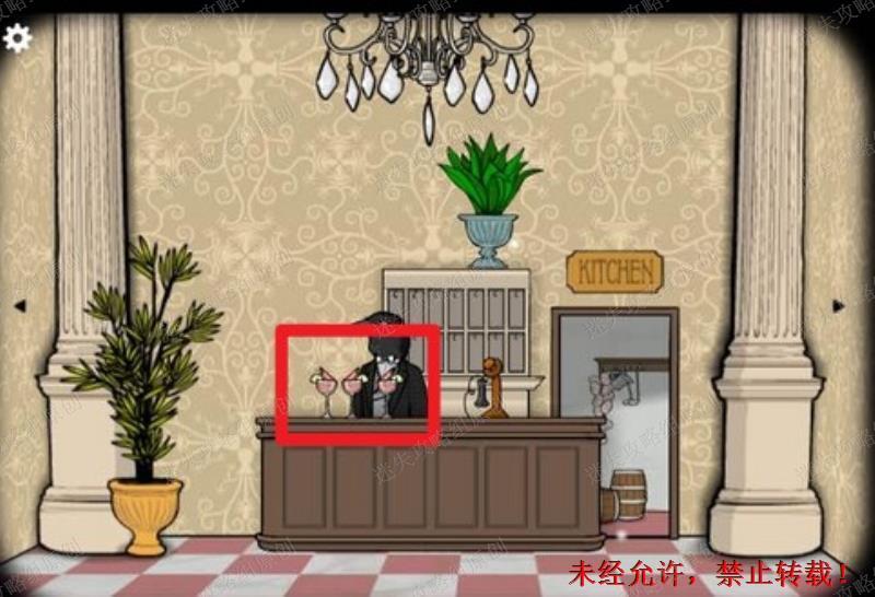 3、首先进入到前台,边上的门去往厨房。前台的五杯“鲜虾鸡尾酒”拿走(这丧心病狂的口味……)。点击乌鸦先生的时候他会说:“欢迎客人们的到来,周到体贴地为他们进行服务。”3