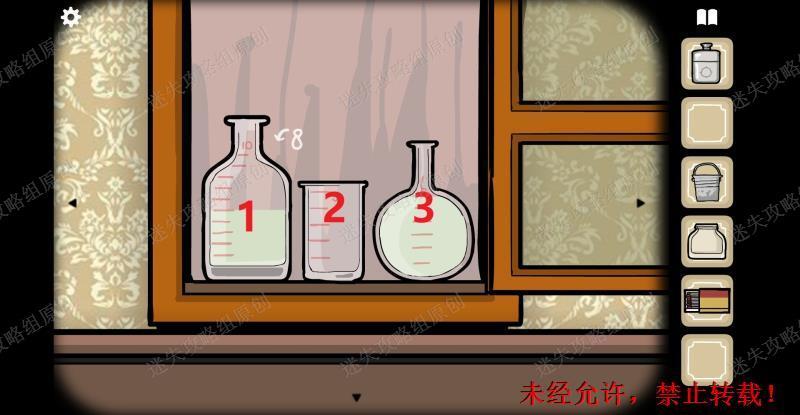 12、前往天平+化学道具桌。首先对中间玻璃柜使用钥匙,打开柜门后开始解谜,解谜的要求是最后我们要用最左边的瓶子得到8的水,解法如下:1. 首先将三个瓶子如下图进行编号。121