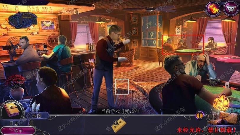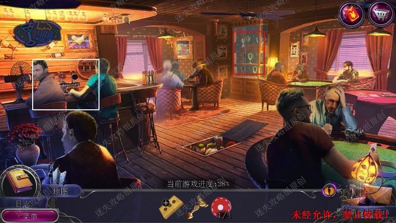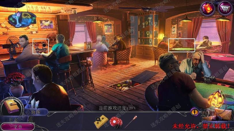 35.点击左边吧台中间的架子,用碎冰锥拿到筹码3,使用盒子和筹码组成卡盒,来到右边桌子给卡盒,完成小游戏,开启新场景到俱乐部外。