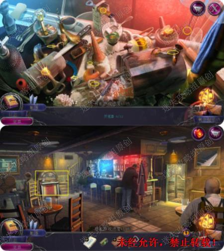 15.到达酒吧后,点击吧台,完成游戏拿到开瓶器磁铁,点击酒吧内的游戏机左边杯子里拿到游戏机的币。