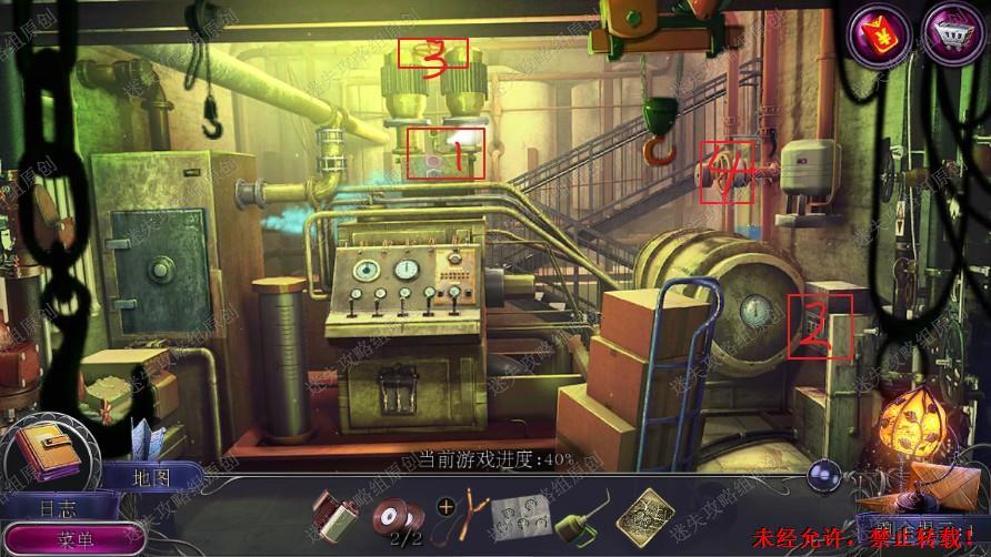 44.在图中一处拿到纽扣,用纽扣打开保险箱(3824密码)拿到包扳手和螺母,螺母和弹弓组合打下顶上发梦,右边墙上管道安上阀门转动拿到夹具。
