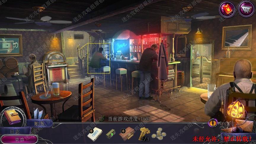 16.从右边进入酒吧内部,游戏机内拿到抹布、手提箱钥匙1和螺丝,在台球桌左侧的木梯,用螺丝合成修好,点击台球桌的吊灯用抹布拿到灯管,台球桌右边拿到台球杆,最右边的飞镖盘拿到飞镖。