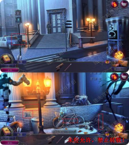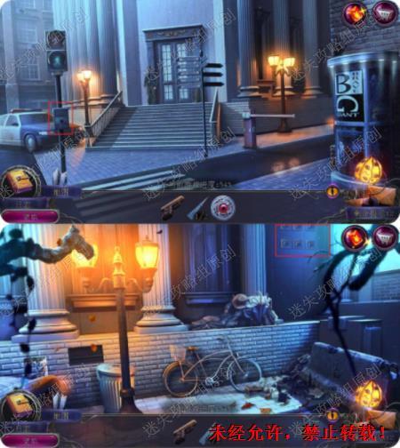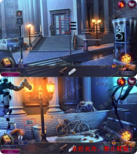 58.回到前门,红绿灯灯杆放入圆块完成游戏(汽车同颜色可以换,同类型也可以换,简单)拿到长钉子2,到银行后面主子右侧墙上放入长钉完成攀爬进入银行。