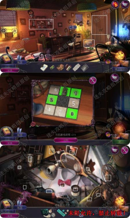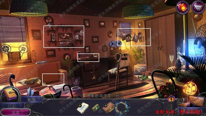 24.在沙发靠垫下拿到圆环,在墙上的架子上拿到盒子,组合盒子圆环完成拼图拿到胶卷和密码,在书桌上拿到镊子和照相机,点击右边绳子上的照片拿到照片,在沙发上用镊子拿到壁橱钥匙1.