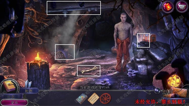 29.在箱子左边拿到阀门,顶上的管道上按上阀门,地上捡到骨头,在左边石头堆里用骨头,拿到箱子部件以及抹布、火把。